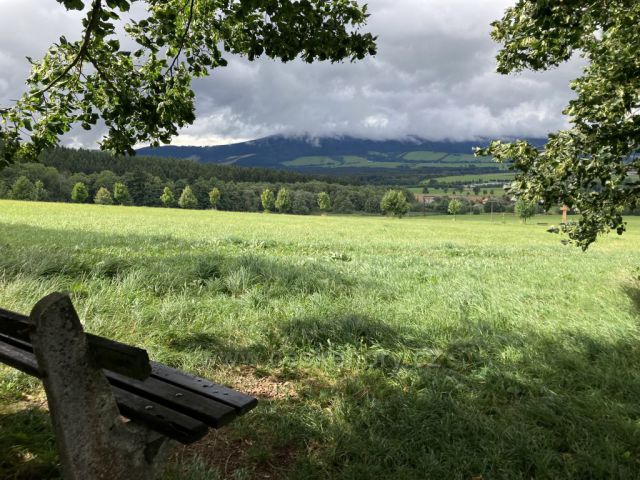Průhled od rozcestí nad Sršňovkou na Slamník a Stezku v oblacích -