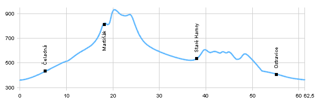 | podél řeky Čeladěnky | | značná část po silnici, ke konci stoupání | | úsek složitým kopcovitým terénem přes kopec 918 m.n.m. | | podél Bílé Ostravice klesáme přes vesnici Bílá | | kolem vodní nádrže Šance | | klesáme zpět do Frýdlantu |