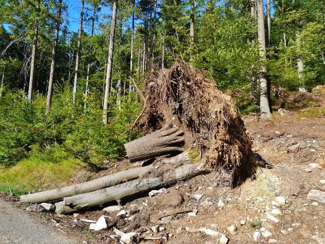 Dolní Morava - pozůstatek červencové vichřice u vrstevnicové cesty po žluté TZ ke Zbojnické chatě
