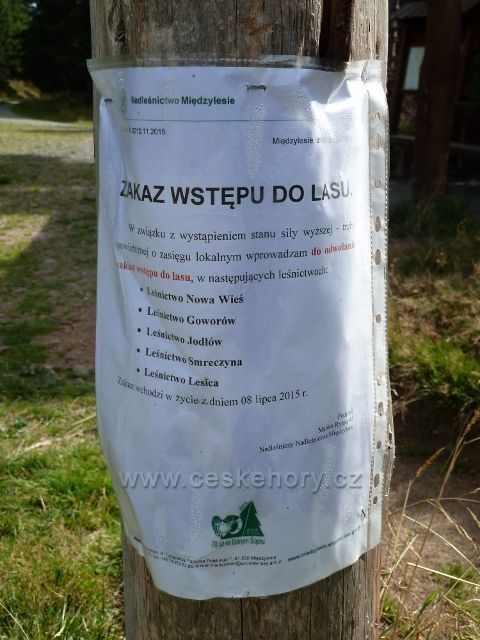 Dolní Morava - sedlo Puchača. Polská vyhláška o zákazu vstupu do lesa po červencové vichřici v oblasti polské části masivu Králického Sněžníku