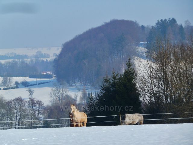 Kněžství - koně v zimním výběhu ve stráni pod Kněžstvím, v pozadí Krejsův kopec