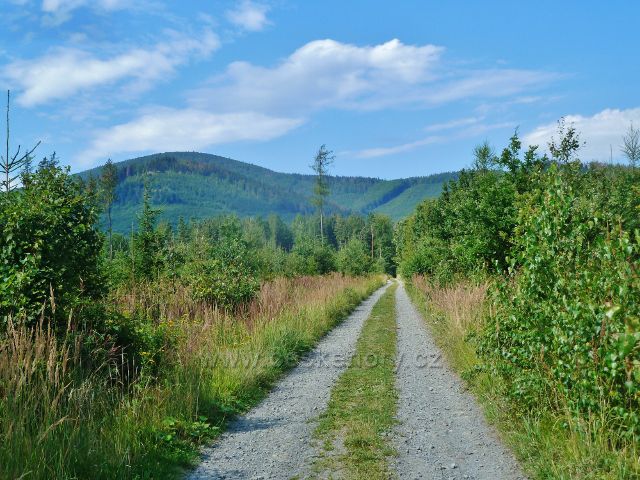 Bystřice n.O. - cesta po modré TZ pod Malý Kozinec.Vpravo je Malý Kozinec(654 m.n.m.), vlevo je Žďár(748 m.n.m.) a za ním vrchol Ostrého(1047 m.n.m.)