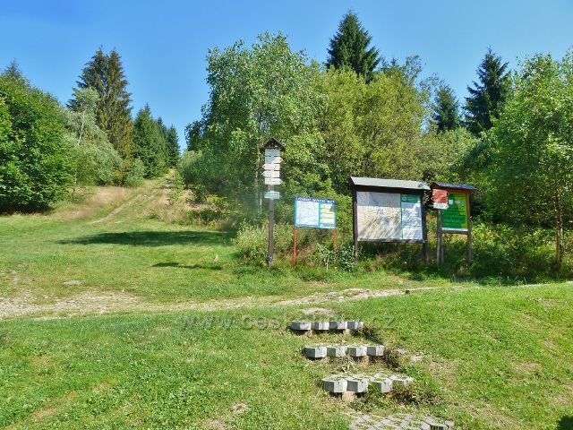 Bukovec - turistický rozcestník "Gírová (chata), 775 m.n.m." a informační tabule před chatou Gírová