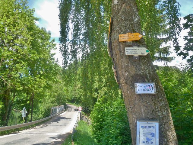 Pastviny - turistický rozcestník "Kraví skok, 488 m.n.m." V pozadí most "Kraví skok" přes jednu ze zátok pastvinské přehrady