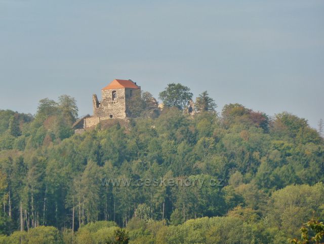 Foto: Brná - pohled z horní části obce na zříceninu hradu Potštejn