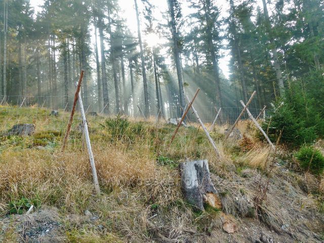 České hory » Orlické hory » Foto: Mladkov - sluneční paprsky prorážejí mlhu na úbočí vrchu Vysoký kámen