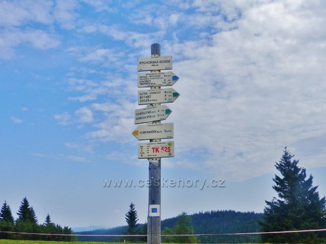 Rýchory - turistický rozcestník "Rýchorská bouda 990 m.n.m."a označení bodu záchrany TK 525