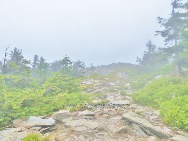 Horní Malá Úpa -před námi se v mlze rýsuje výhledové místo na vrcholku Tabule ve výšce 1282 m.n.m.