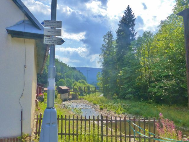 České hory » Krkonoše » Foto: Horní Maršov - turistický rozcestník "Temný Důl(bus), 595 m.n.m." nad řekou Úpou