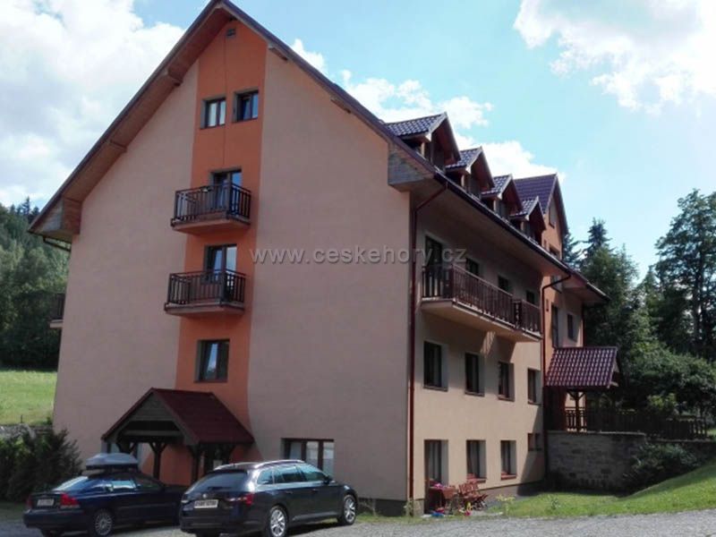 Nabízíme nově vybavený apartmán 2+kk o rozloze 43 m2, plně vybavená kuchyně s jídelním koutem, obytný pokoj se spací částí 5 lůžek + 2 přistýlky, koupelna s WC a sprchovým koutem, sklepní kóje pro uložení lyží/kol, vlastní parkování, Wi-Fi.