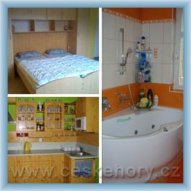 Ubytování pro dvojci v létě i v zimě ! Termíny NE - SO s večeřemi. Nástupy NEDĚLE 16,00 hod. vč. 1.večeře, úhrada kauce na byt ve výši 500,- Kč. Odjezdový den SOBOTA, předání pokojů v 11:00, vrácení kauce. Individuelně lze domluvit změnu stravy i termínu. Popis: Bezbarierový byt 1+kk,chodba, komora, WC + nadstandardně vybavená koupelna (vana s vířivkou, pohled... více >>
