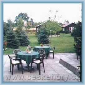 6x 4lůžk. chata se soc.zař.topením,terasou, 7x 2-3lůžk. pokoje se soc.zař.letní terasa, rybníček, parkování v areálu, stylová restaurace s krbem