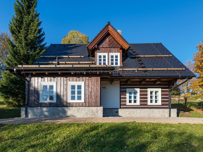Luxusní chalupa k pronájmu, dva oddělené apartmány s vlastní koupelnou po pěti lůžkách, společný prostor sednice s kachlovými kamny, kuchyň, sauna, lyžárna/kolárna, krytá 2 venkovní stání, celkem pro 10 lidí. Plný komfort. S velkým pozemkem zaručující soukromí. Běžecké trasy za chalupou.