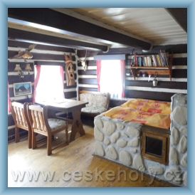 Pronájem pro 2 až 8 osob, nejlépe dvojice, rodiny apod. Neposkytuji chalupu pro víkendové pařby a mejdany! Standardní vybavení: kuchyň (lednice, el. dvouvařič s troubou, rychlovarná konvice), umyvadlo, sprcha, wc, tv, rádio, kamna, elektro, voda, venkovní sezení včetně grilu a ohniště. V přízemí se nachází světnice (dvě postele), kuchyň, sprcha a wc. V patře ložnice (dvě postele) a pokoj (čtyři postele).